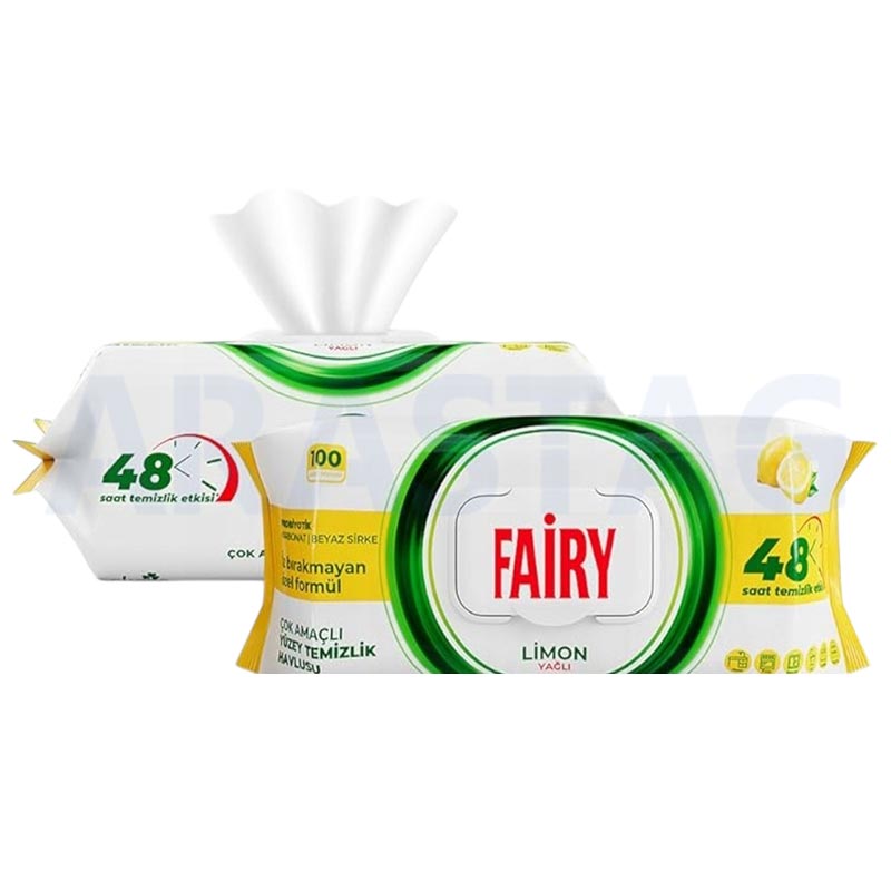 دستمال مرطوب سطوح فیری Fairy رایحه لیمویی بسته 100 عددی، گزینهای فوقالعاده برای تمیزکاری سریع، مؤثر و بدون دردسر در منزل، محل کار یا خودرو است.